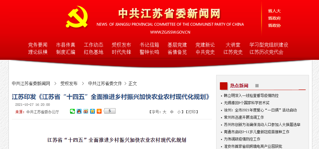 ▌10月27日,《江苏省“十四五”全面推进乡村振兴加快农业农村现代化规划》正式印发。