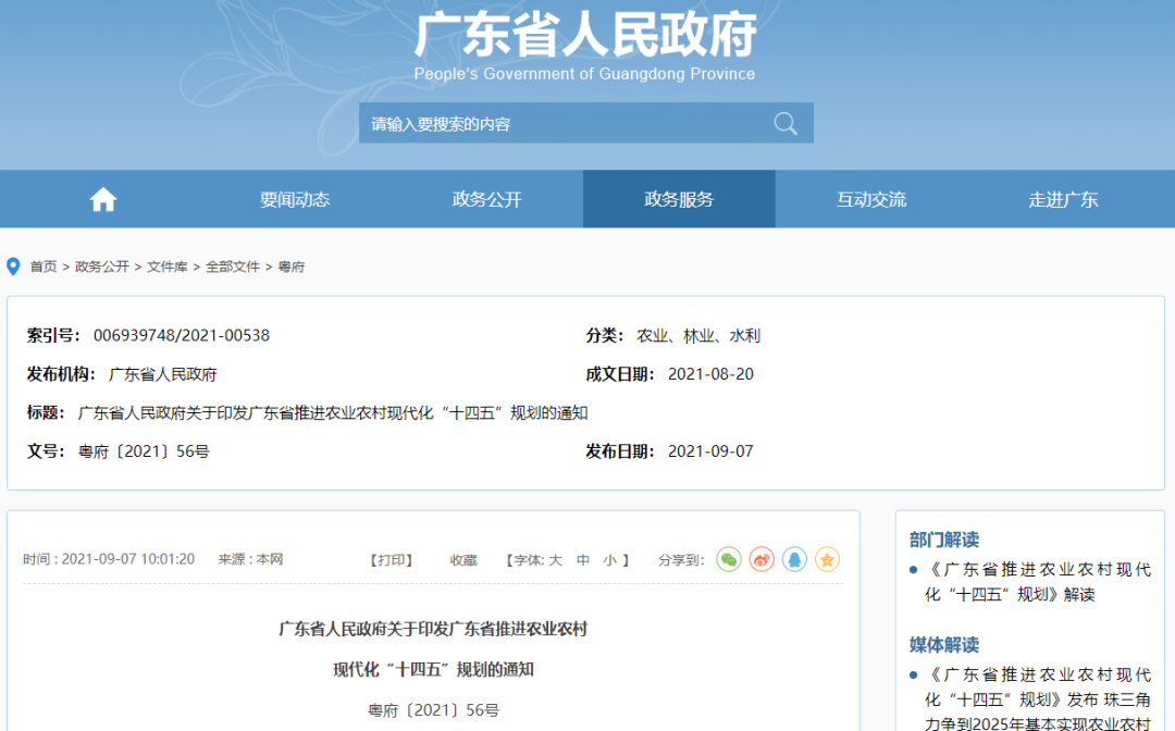 ▌9月7日,广东省政府正式印发《广东省推进农业农村现代化“十四五”规划》。