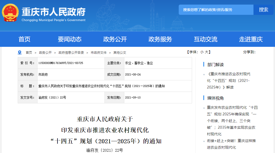 ▌9月10日,重庆市人民政府印发《重庆市推进农业农村现代化“十四五”规划(2021—2025年)》。
