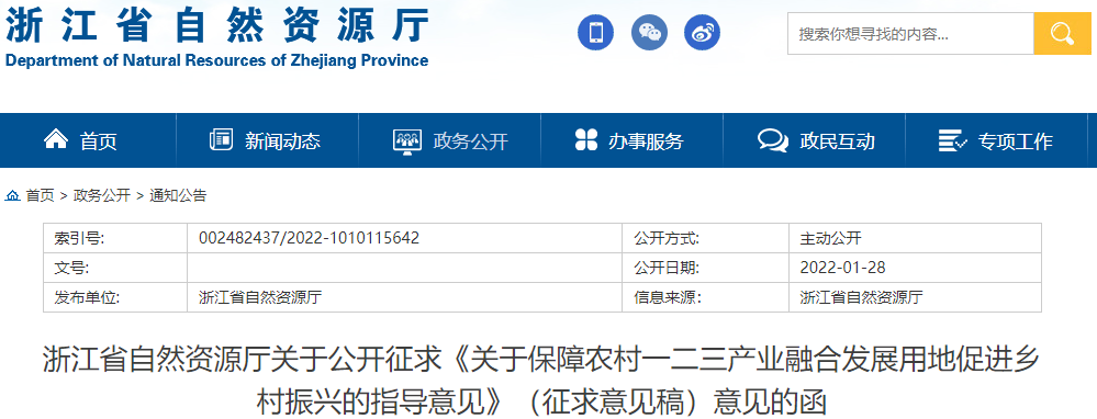 为保障保障农村一二三产业融合发展用地,促进乡村振兴,根据《自然资源部 国家发展改革委 农业农村部关于保障和规范农村一二三产业融合发展用地的通知》(自然资发〔2021〕16号)等有关文件要求,我厅起草了《关于保障农村一二三产业融合发展用地促进乡村振兴的指导意见(征求意见稿)》。现公开征求社会各界意见,征求意见截止时间为2022年2月20日。有关单位和社会各界人士可以通过以下三种方式提出意见: